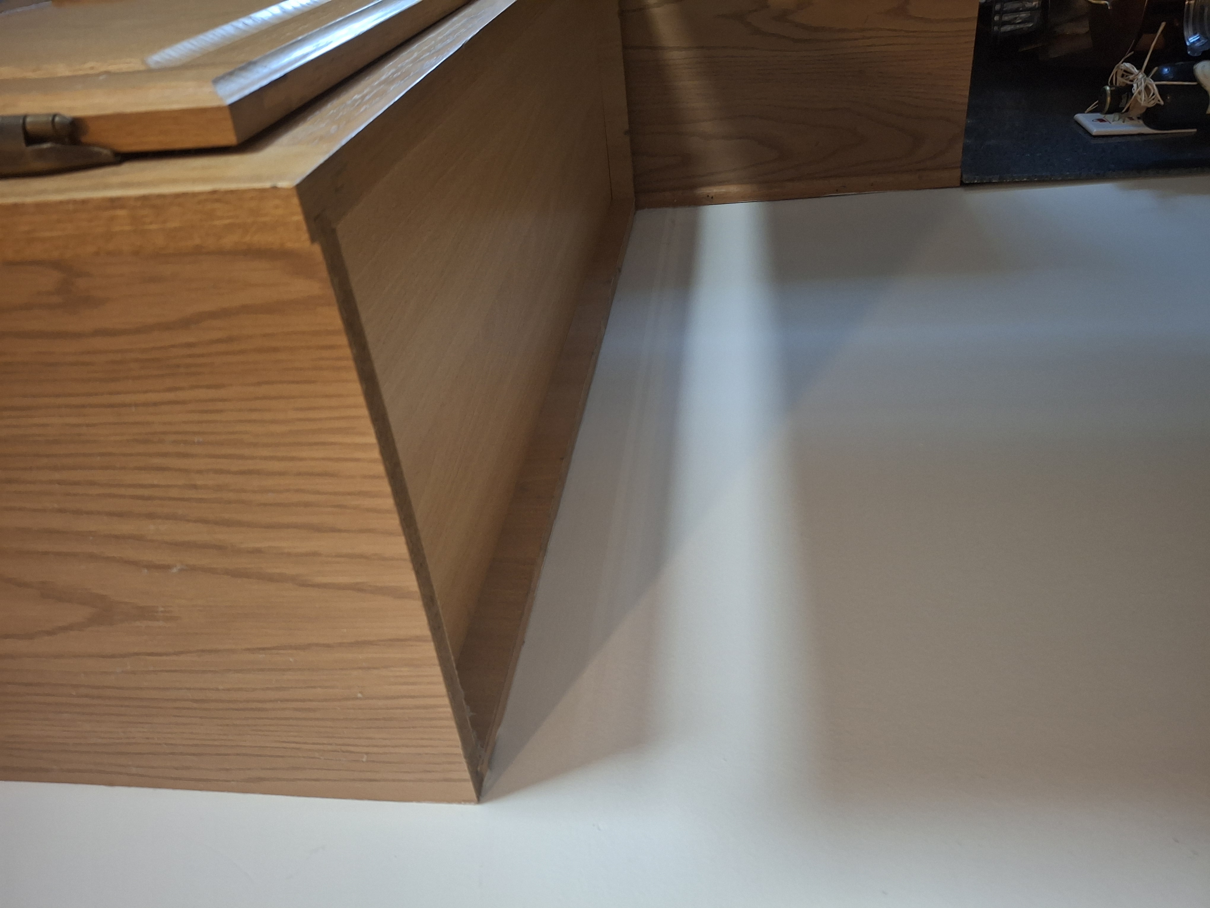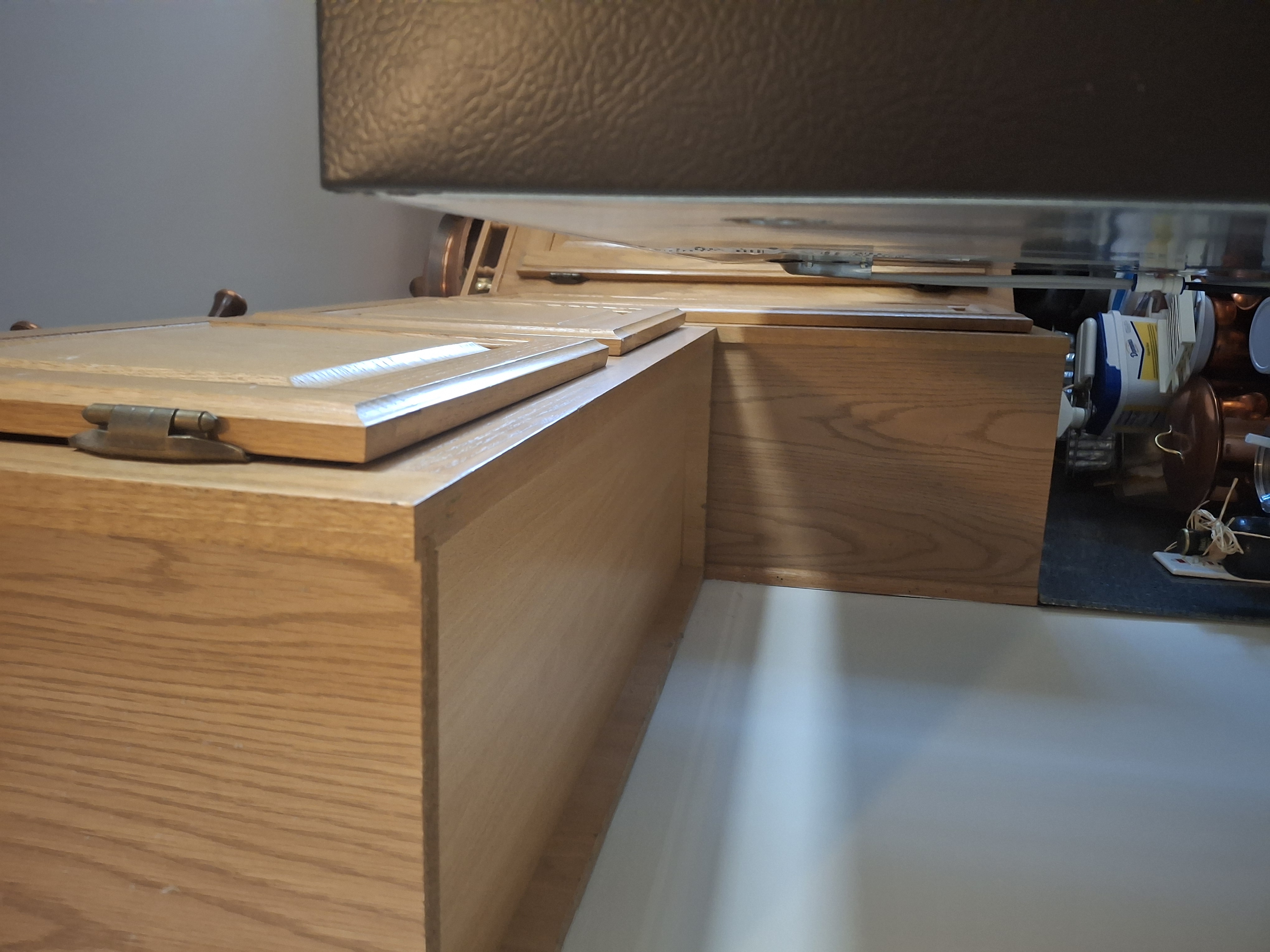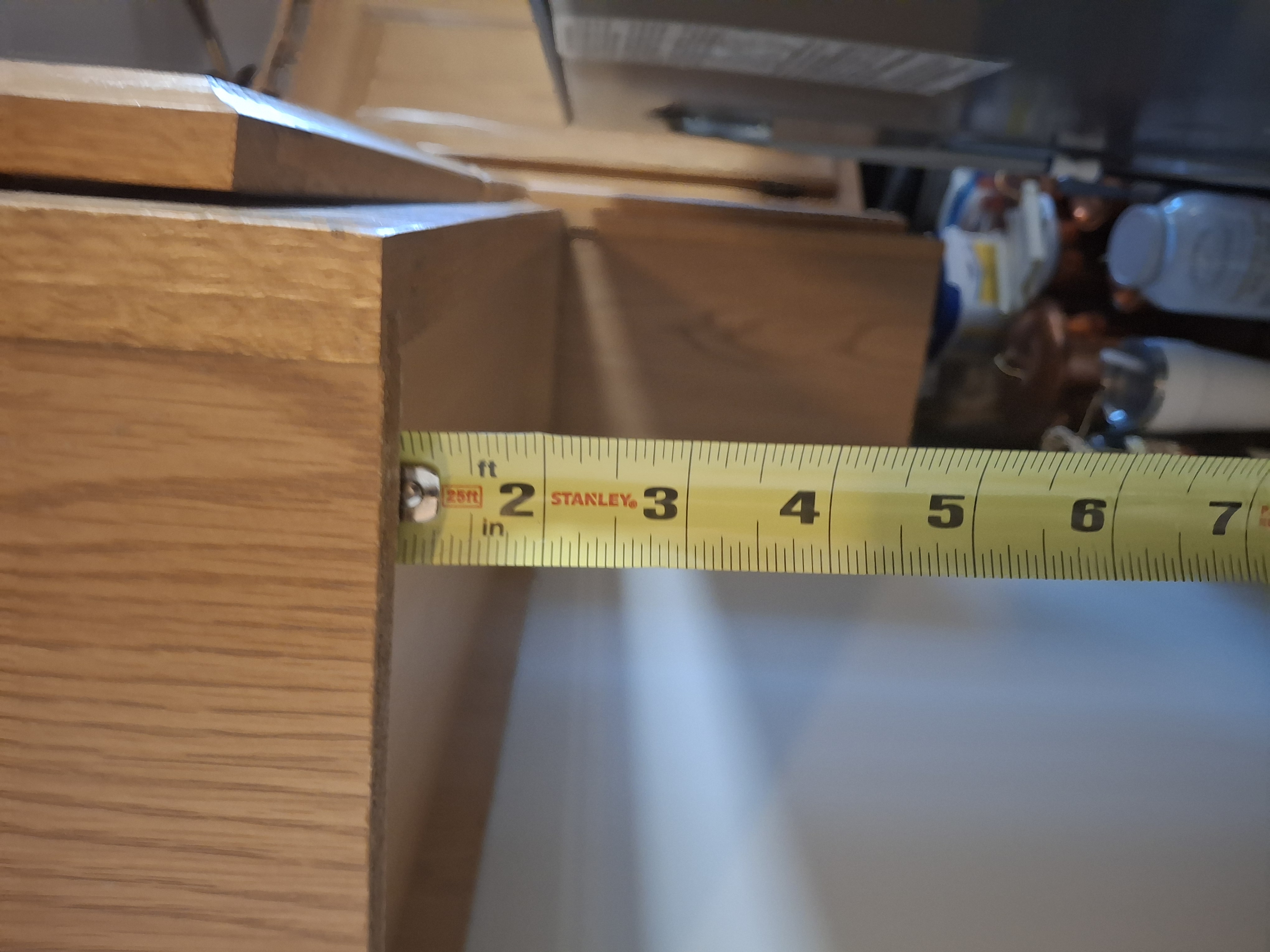 Cut cabinet so refig will fit. Ian and Ray. No helpers no supplies needed